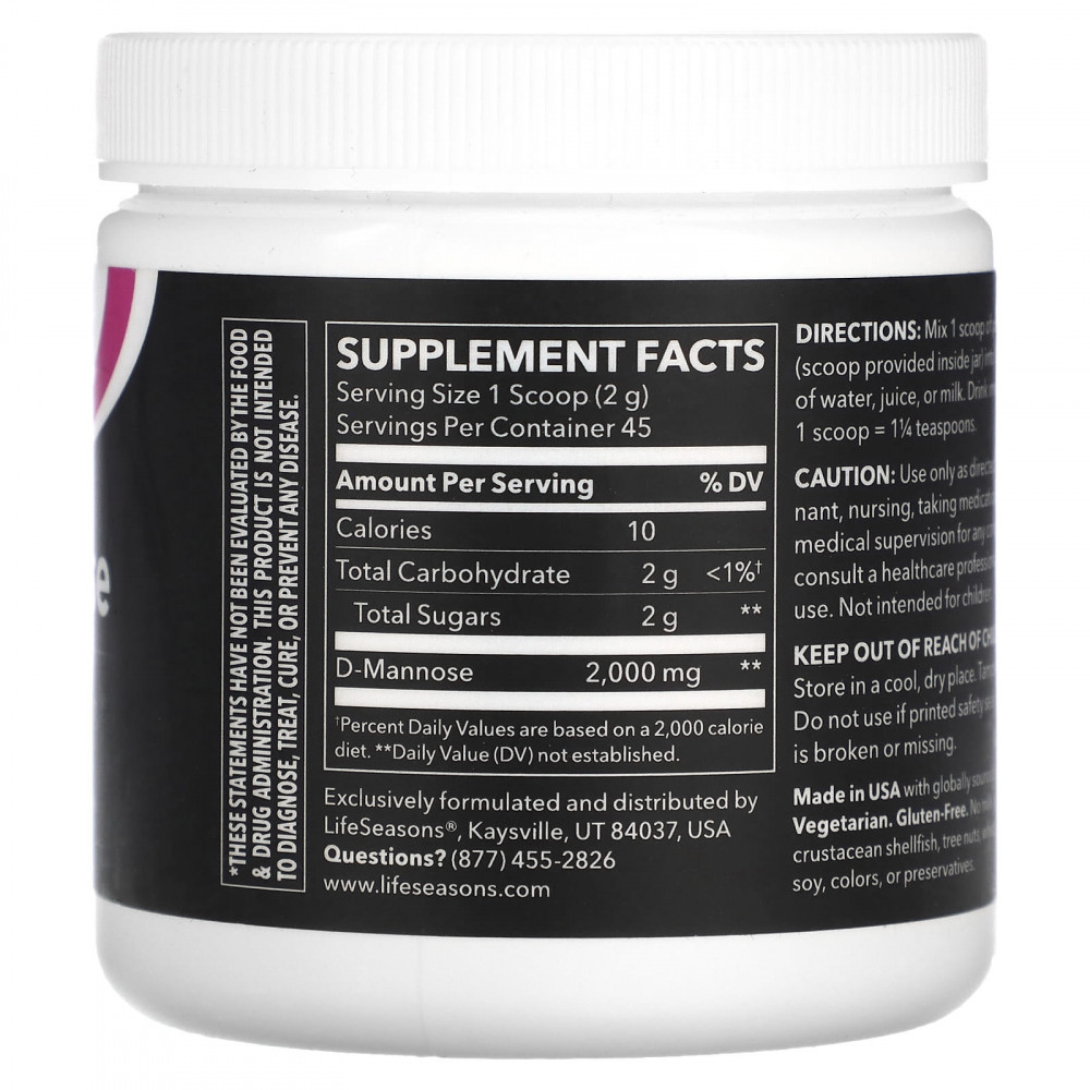 D-манноза - это простой сахар, который не метаболизируется организмом и выводится с мочой. Это может помочь поддержать здоровье мочевыводящих путей, препятствуя прилипанию микробов к стенке мочевого пузыря. 2000 мг - клиническая доза.