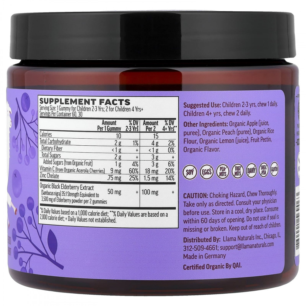 | Экстракт органической черной бузины (Sambucus nigra) с соотношением сил 35:1, что эквивалентно 3500 мг порошка бузины в 2 жевательных таблетках | 50 мг | + | 100 мг | + |