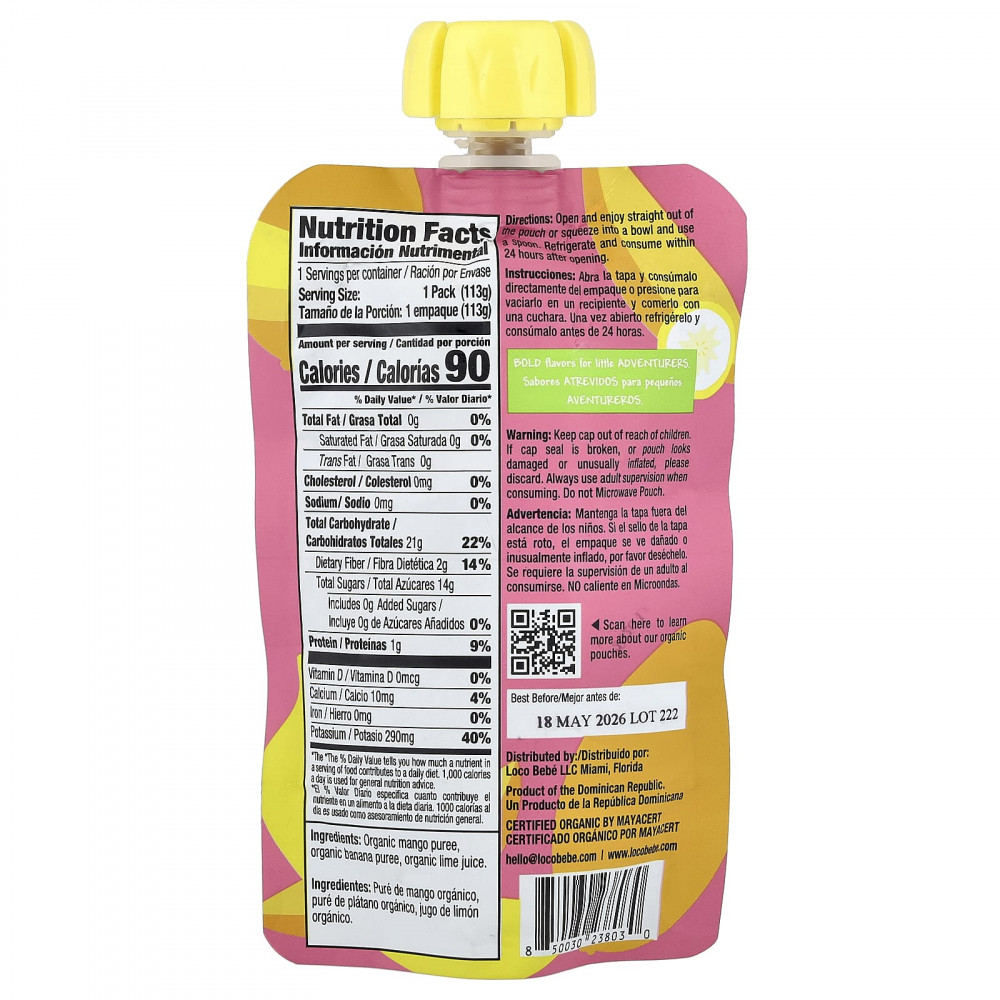 Один из самых популярных вкусов Loco Bebé содержит богатый питательными веществами органический банан местного происхождения и сладкое органическое манго для яркого снека, содержащего обильный уровень калия и клетчатки. Это эффективное сочетание питательных веществ помогает поддерживать ваши цели — предлагать полезные снеки, когда ваш малыш находится в дороге. разработано для младенцев, но подходит для всех возрастов; Вы никогда не перерастете Карибы!