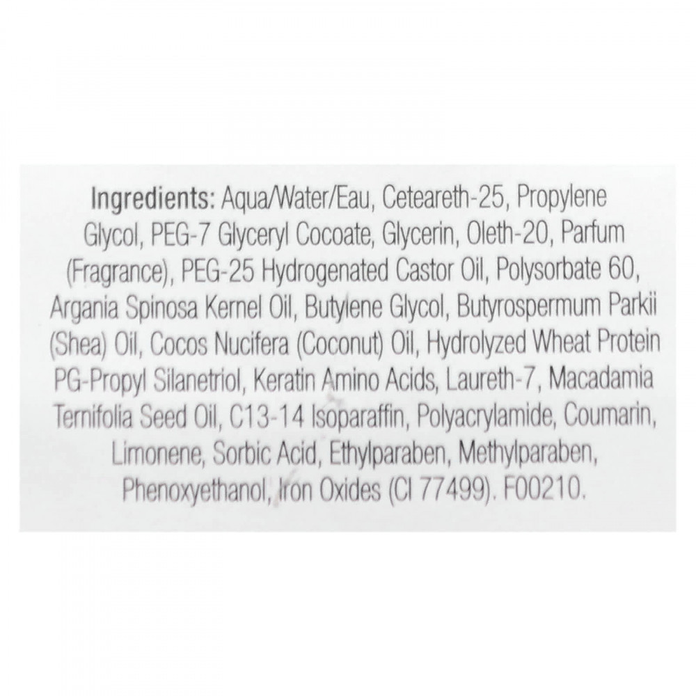 Вода (Aqua/eau), цетеарет-25, пропиленгликоль, ПЭГ-7 глицерил кокоат, глицерин, олет-20, парфюмерная композиция (отдушка), ПЭГ-25 гидрогенизированное касторовое масло, полисорбат 60, аргановое масло (Argania spinosa), бутиленгликоль, масло ши (Butyrospermum parkii), кокосовое масло (Cocos nucifera), гидролизованный белок пшеницы ПГ-пропил силантриол, аминокислоты кератина, лаурет-7, масло макадамии (Macadamia ternifolia), c13-14 изопарафин, полиакриламид, кумарин, лимонен, сорбиновая кислота, этилпарабена, метилпарабен, феноксиэтанол, оксиды железа (CI 77499).