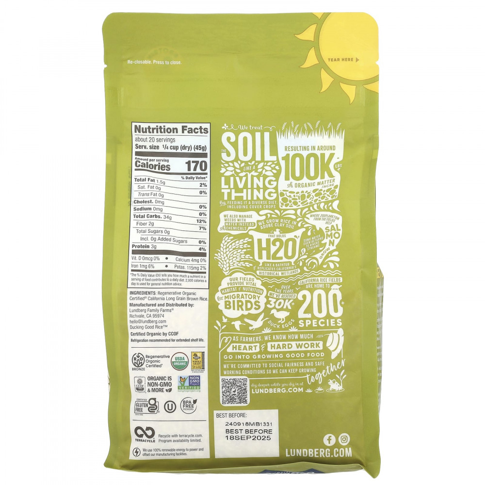 Длиннозерный коричневый рис Калифорния с сертификатом Regenerative Organic Certified®.