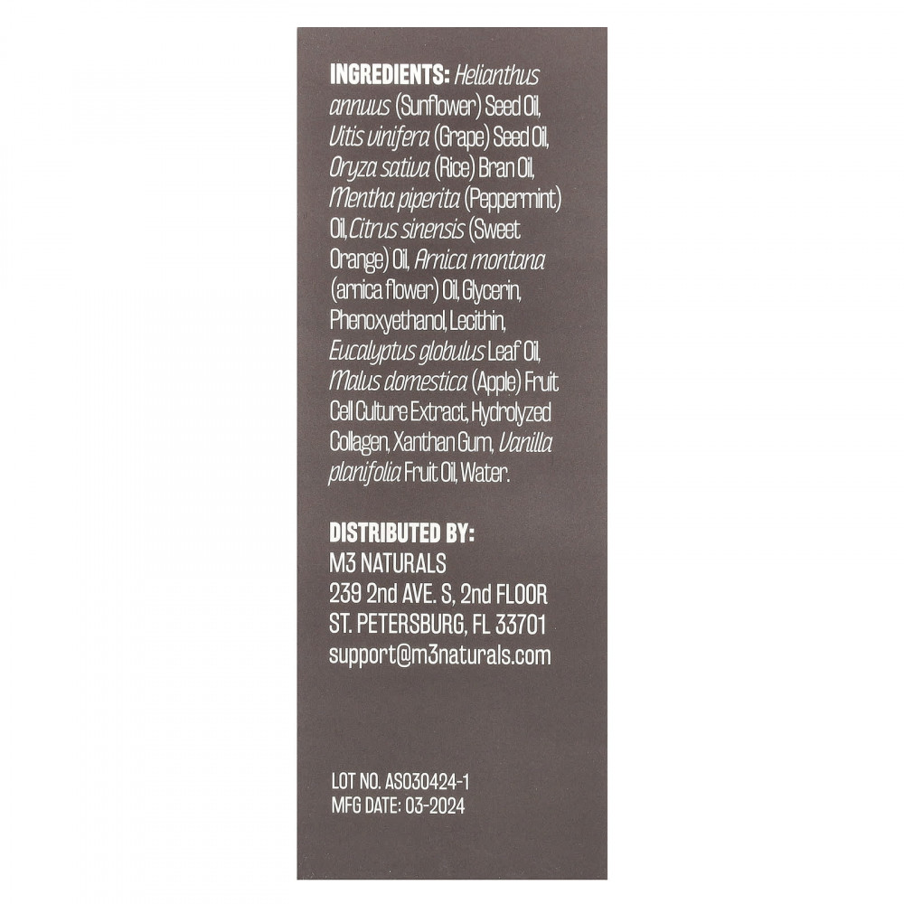 Подсолнечное масло (Helianthus annuus), масло из виноградных косточек (Vitis vinifera), масло из рисовых отрубей (Oryza sativa), масло перечной мяты (Mentha piperita), масло сладкого апельсина (Citrus sinensis), масло арники (Arnica montana), глицерин, феноксиэтанол, лецитин, масло из листьев эвкалипта шаровидного (Eucalyptus globulus), экстракт культуры клеток плодов яблони домашней (Malus domestica), гидролизованный коллаген, ксантановая камедь, масло плодов ванили, вода.