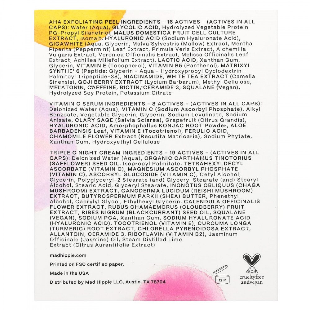Ночной крем Triple C - 19 активных ингредиентов: (Активные элементы выделены жирным шрифтом) Вода, органический сафлор красильный (сафлор) масло семянИзопропил пальмитаттетрагексилдецил аскорбат (витамин С), аскорбилфосфат магния (витамин С), аскорбил глюкозид (витамин C), цетиловый спирт, глицерин, полиглицерил-2 стеарат (и) глицерил стеарат (и) стеариловый спирт, стеариновая кислота, глицерил стеарат, инонотускосой (гриб чага) извлекать, Ganoderma lucidum (гриб рейши) извлекать, Butyrospermum parkii масло ши, фенетиловый спирт, каприлилгликоль, этилгексилглицерин, экстракт цветков календулы лекарственной, Rubus chamaemorus (морошка) (фруктовый экстракт), Ribes nigrum (черная смородина) масло семян сквалан (веганский), натрия pca, ксантановая камедь, гиалуронат натрия (гиалуроновая кислота) (гиалуроновая кислота), токотриенол (витамин E), Curcuma longa (куркума) membranaceus), экстракт хлореллы (Chlorella pyrenoidosa), аллантоин, керамид 3, рибофлавин (витамин B2), масло жасмина (Jasminum officinale), экстракт лайма паровой дистилляции (Citrus aurantifolia).
