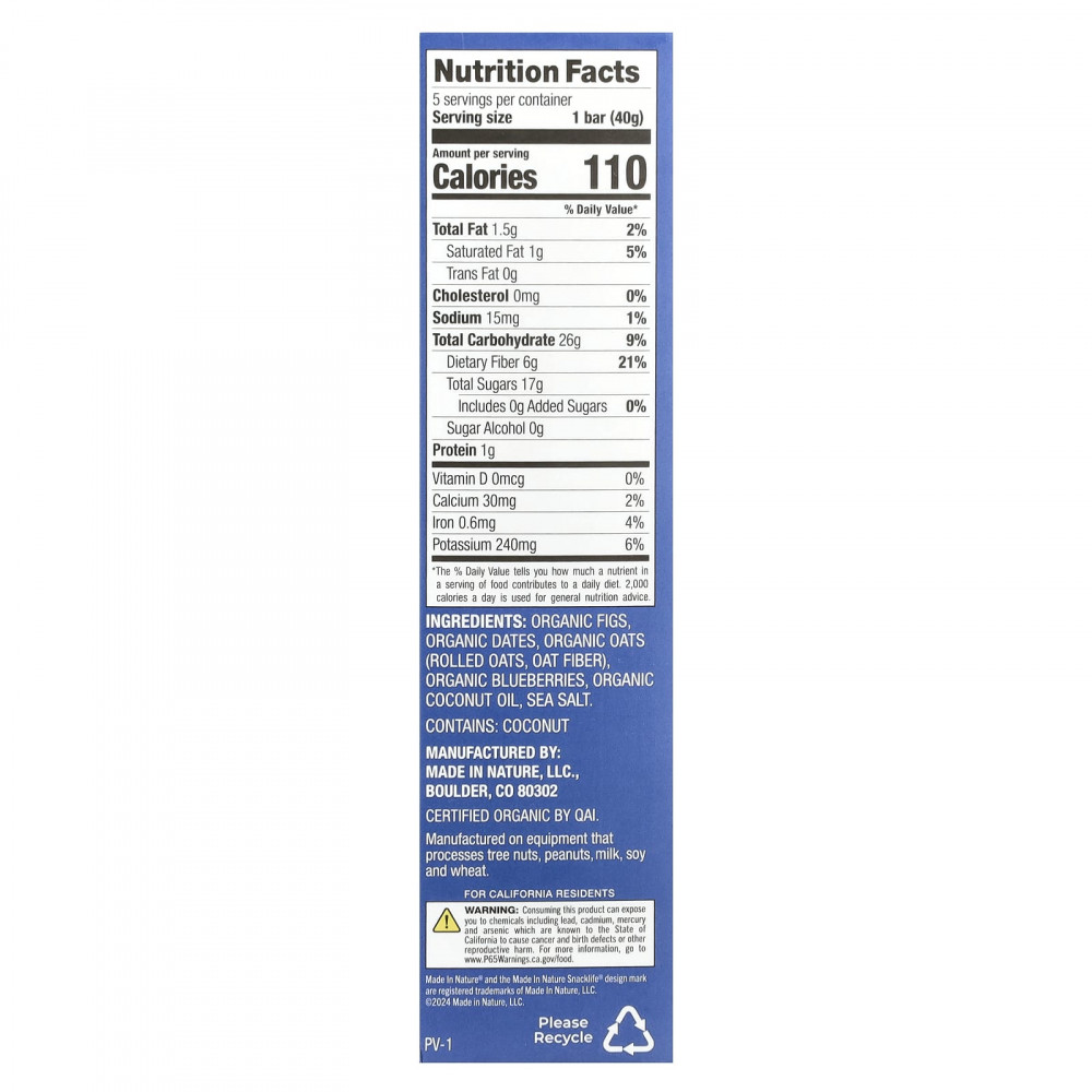 Органический инжир, органические финики, органический овес, овсяная клетчатка), органическая черника, органическое кокосовое масло, морская соль.