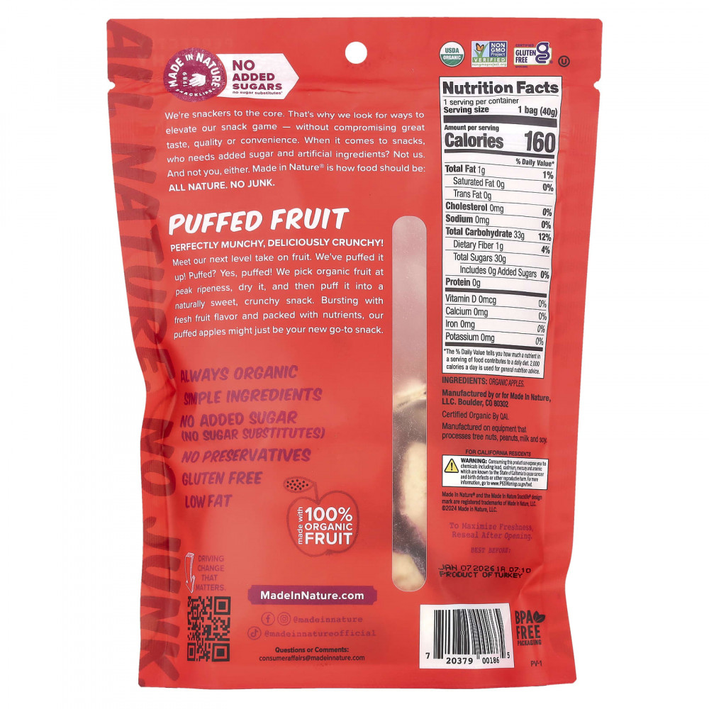 Безупречно аппетитные, восхитительно хрустящие! Встречайте наш новый взгляд на фрукты. Мы надули! Пыхтел? Да пыхтел! Мы собираем органические фрукты на пике спелости, сушим их, а затем превращаем в сладкую хрустящую закуску. Наши воздушные яблоки со вкусом свежих фруктов и питательными веществами могут стать вашим новым перекусом.