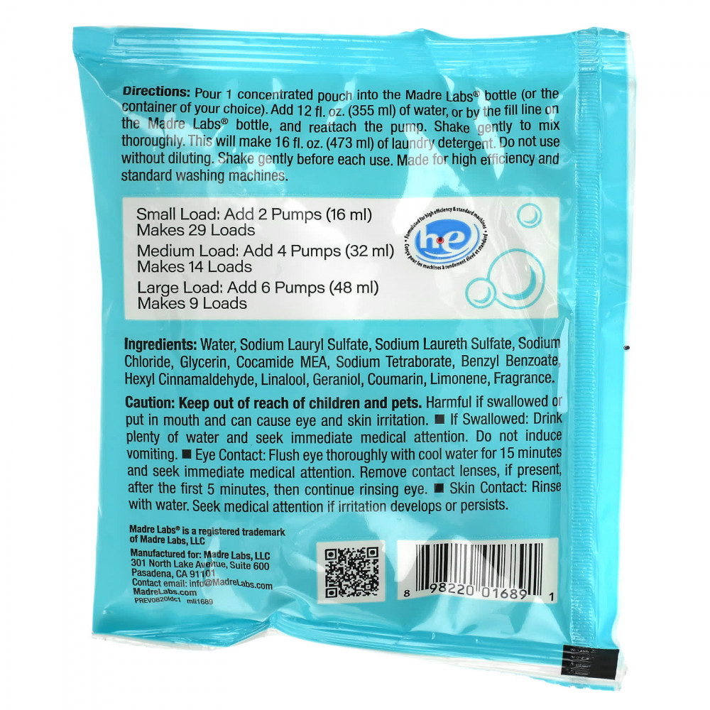 Рекомендации по применению. Вылейте содержимое 1 пакетика с концентратом во флакон Madre Labs® (или в любую другую емкость). Добавьте 355 мл (12 жидк. унций) воды (или до линии наполнения на флаконе Madre Labs®) и установите дозатор. Аккуратно встряхните для тщательного перемешивания. Вы получите 473 мл (16 жидк. унций) моющего средства для стирки. Не использовать без разбавления. Аккуратно встряхивайте перед каждым использованием. Средство предназначено для высокопроизводительных и стандартных стиральных машин.