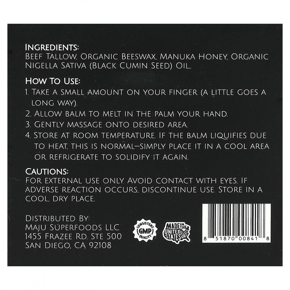 говяжий жир. органический пчелиный воск, мед манука, органическое масло из семян черного тмина (Nigella sativa).