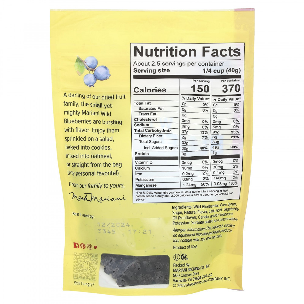 Любимая ягода нашего семейства сухофруктов, маленькая, но полезная дикорастущая голубика Мариани, наполнена ароматом. Ешьте ими салат, добавляйте в печенье, овсянку или прямо из упаковки (мой фаворит!)