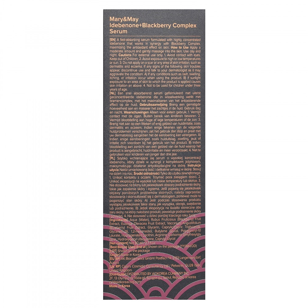 Вода, экстракт ягод ежевики (Rubus fructicosus), экстракт ягод асаи (Euterpe oleracea), экстракт плодов ягоды (Vaccinium angustifolium), глицерин, каприловый/каприновый триглицерид, глицерет-26,1,2-гександиол, бутиленгликоль, полиглицерил-10 лаурат, гидрогенизированный лецитин, аргинин, карбомер, этилгексилглицерин, гидроксидезил убихинон, каприлилгликоль.