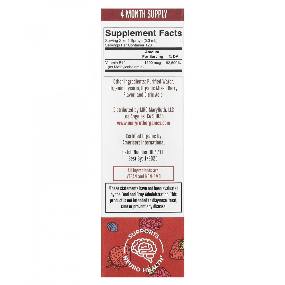 Поддержите работу мозга, нервную систему и эритроциты с помощью этого веганского витамина B12 в форме спрея с восхитительным ягодным вкусом. Сохраняйте нормальный уровень энергии в организме и здоровье мозга, поддерживая здоровье нервной системы с помощью вкусного ягодного спрея.