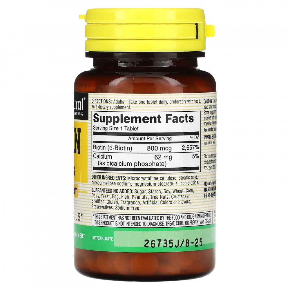 Таблетки биотина популярны, потому что биотин может играть важную роль в поддержании здоровья волос, кожи и ногтей. Наша высокоэффективная формула с 800 мкг биотина может стимулировать выработку аминокислот, которые имеют решающее значение для образования кератина. Кератин - самый важный белок в волосах, который способствует нормальному росту волосяных фолликулов. Симптомы дефицита биотина могут включать выпадение волос или чешуйчатую красную сыпь на коже. Хотя биотин содержится во многих продуктах, которые мы едим, это водорастворимый витамин, поэтому он не сохраняется в организме надолго. Это означает, что ваш организм использует только то, что ему нужно, а остальное выделяет. Вот почему наличие высокоэффективного источника биотина в удобных таблетках, которые можно принимать в течение дня, может быть простым способом обеспечить его достаточный уровень для оптимального здоровья.