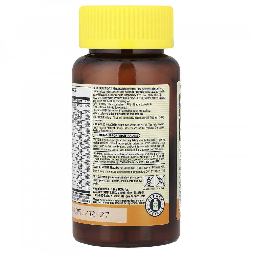 Наша комплексная формула ежедневного приема мультивитаминов с минералами содержит 24 незаменимых витамина и минерала, в том числе: Витамин А может поддерживать многие жизненно важные функции, включая здоровый иммунитет, здоровье глаз, а также здоровое развитие и функционирование клеток. Известно, что витамин D способствует всасыванию и усвоению кальция в кишечнике и может снизить риск развития остеопороза. Витамины группы B, фолиевая кислота, витамины B12, B1, B2, B6, ниацин и пантотеновая кислота способствуют преобразованию пищи в энергию и помогают поддерживать нормальный уровень энергии, выработку эритроцитов и работу сердечно-сосудистой, дыхательной и нервной систем. Витамины A, C и E помогают поддерживать антиоксидантную защиту организма, участвуя в нейтрализации токсичных свободных радикалов. Минералы, такие как медь, цинк и магний, помогают регулировать важные процессы в организме. Наша формула для ежедневного приема нескольких витаминов с минералами обеспечивает основу для поддержания оптимального здоровья и хорошего самочувствия.