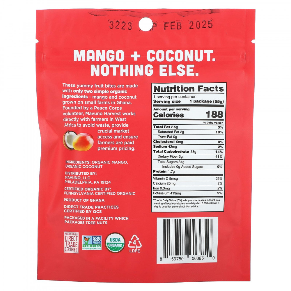 Эти вкусные фруктовые кусочки изготовлены всего из двух простых органических ингредиентов — манго и кокоса, выращенных на небольших фермах в Гане. Компания Mavuno Harvest, основанная добровольцем из Corps Peace, напрямую работает с фермерами в Западной Африке, чтобы избежать отходов, обеспечить доступ к важным рынкам и обеспечить фермерам выплаты по премиальным ценам.