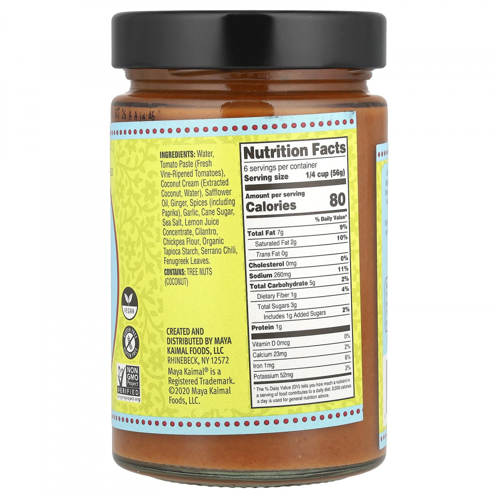 Вода, томатная паста (свежие созревшие томаты), кокосовый крем (экстракт кокоса, вода), сафлоровое масло, имбирь, специи (включая перец), чеснок, тростниковый сахар, морская соль, концентрат лимонного сока, кинза, нутовая мука, органический тапиоковый крахмал, серрано чили, листья пажитника.