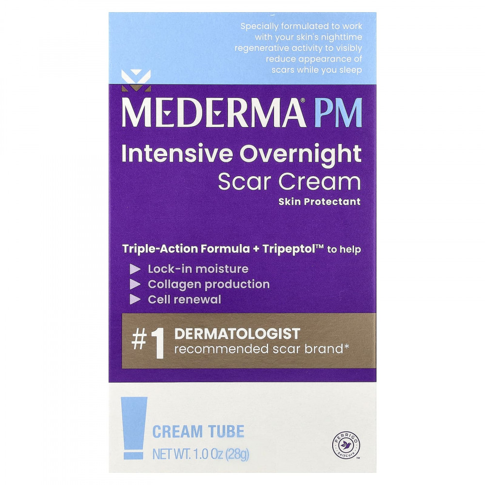 Ночной крем от шрамов Mederma® PM содержит питательный комплекс Tripeptol™ с пептидами, коллагеном и антиоксидантами, который придает коже здоровый вид.