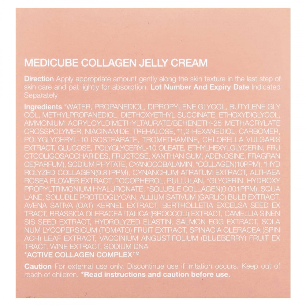 * Вода, пропандиол, дипропиленгликоль, бутиленгликоль, метилпропандиол, диэтоксиэтил сукцинат, этоксидигликоль, аммоний акрилоилдиметилтаурата/бегенет-25 метакрилата кроссполимер, никотинамид, трегалоза, * 1,2-гександиол, карбомер, полиглицерил-10 изостеарат, трометамин, экстракт хлореллы (Chlorella vulgaris), глюкоза, полиглицерил-10 олеат, этилгексилглицерин, фруктоолигосахариды, фруктоза, ксантановая камедь, аденозин, отдушка (парфюмерная композиция), фитат натрия, цианокобаламин, * коллаген (10 част. / млн), * гидролизованный коллаген (9,81 част. / млн), экстракт цинанхума (Cynanchum atratum), экстракт цветков штокрозы розовой (Althaea rosea), токоферол, пуллулан, глицерин*, гиалуронат гидроксипропилтримония, * растворимый коллаген (0,001 част. / млн), сквалан, растворимый протеогликан, экстракт луковиц чеснока (Allium sativum), экстракт ядер овса (Avena sativa), экстракт семян bertholletia excelsa, экстракт брокколи (Brassica oleracea italica), экстракт семян зеленого чая (Camellia sinensis), гидролизованный эластин, экстракт яиц лосося, экстракт плодов томатов (Sola num lycopersicum), экстракт листьев шпината (Spinacia oleracea), экстракт плодов голубики (Vaccinium angustifolium), винный экстракт, днк натрия.