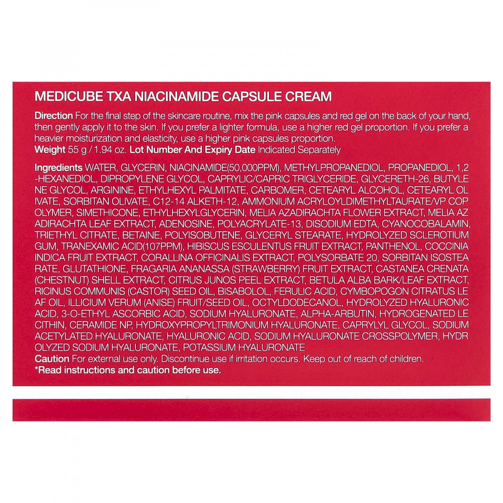 Вода, глицерин, никотинамид (50 000 част./млн), метилпропандиол, пропандиол, 1,2-гександиол, дипропиленгликоль, каприловый/каприновый триглицерид, глицерет-26, бутиленгликоль, аргинин, этилгексил пальмитат, карбомер, цетеариловый спирт, цетеарил оливат, сорбитан оливат, c12-14 алкет-12, аммоний акрилоилдиметилтаурат/ВП сополимер, симетикон, этилгексилглицерин, экстракт цветков дерева ним (Melia azadirachta), экстракт листьев дерева ним (Melia azadirachta), аденозин, полиакрилат-13, двунатриевая ЭДТК, цианокобаламин, триэтилцитрат, бетаин, полиизобутен, глицерил стеарат, гидролизованная камедь склероций, транексамовая кислота (107 част./млн), экстракт плодов гибискуса (Hibiscus esculentus), пантенол, экстракт плодов кокцинии индийской (Coccina indica), экстракт кораллины лекарственной (Corallina officinalis), полисорбат 20, сорбитан изостеарат, глутатион, экстракт ягод клубники (Fragaria ananassa), экстракт скорлупы каштана (castanea crenata), экстракт кожуры юдзу (Citrus junos), экстракт коры/листьев березы белой (Betula alba), касторовое масло (Ricinus communis), бисаболол, феруловая кислота, масло из листьев лемонграсса (Cymbopogon citratus), масло из плодов и семян аниса (Illicium verum), октилдодеканол, гидролизованная гиалуроновая кислота, 3-о-этил-аскорбиновая кислота, гиалуронат натрия, альфа-арбутин, гидрогенизированный лецитин, керамид NP, гиалуронат гидроксипропилтримония, каприлилгликоль, ацетилированный гиалуронат натрия, гиалуроновая кислота, кроссполимер гиалуроната натрия, гидролизованный гиалуронат натрия, гиалуронат калия.