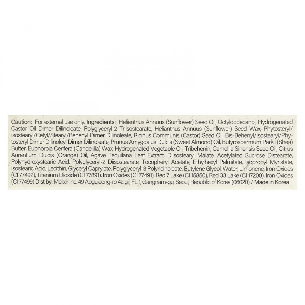 Подсолнечное масло (Helianthus annuus), октилдодеканол, димер дилинолеат гидрогенизированного касторового масла, полиглицерил-2 триизостеарат, воск из семян подсолнечника (Helianthus annuus), фитостерил/изостеарил/цетил/стеарил/бегенил димер дилинолеат, касторовое масло (Ricinus communis), бис-бегенил/изостеарил/фитостерил димер дилинолеил димер дилинолеат, масло сладкого миндаля (Prunus amygdalus dulcis), масло ши (Butyrospermum parkii), канделильский воск (Euphorbia cerifera), гидрогенизированное растительное масло, трибехенин, масло из семян зеленого чая (Camellia sinensis), масло апельсина (Citrus aurantium dulcis), экстракт листьев голубой агавы (Agave tequilana), диизостеарил малат, ацетилированный дистеарат сахарозы, полигидроксистеариновая кислота, полиглицерил-2 диизостеарат, токоферилацетат, этилгексил пальмитат, изопропил миристат, изостеариновая кислота, лецитин, глицерил каприлат, полиглицерил-3-полирицинолеат, бутиленгликоль, вода, лимонен, оксиды железа (CI 77492), диоксид титана (CI 77891), оксиды железа (CI 77491), краситель красный 7 лак (CI 15850), краситель красный 33 лак (CI 17200), оксиды железа (CI 77499).