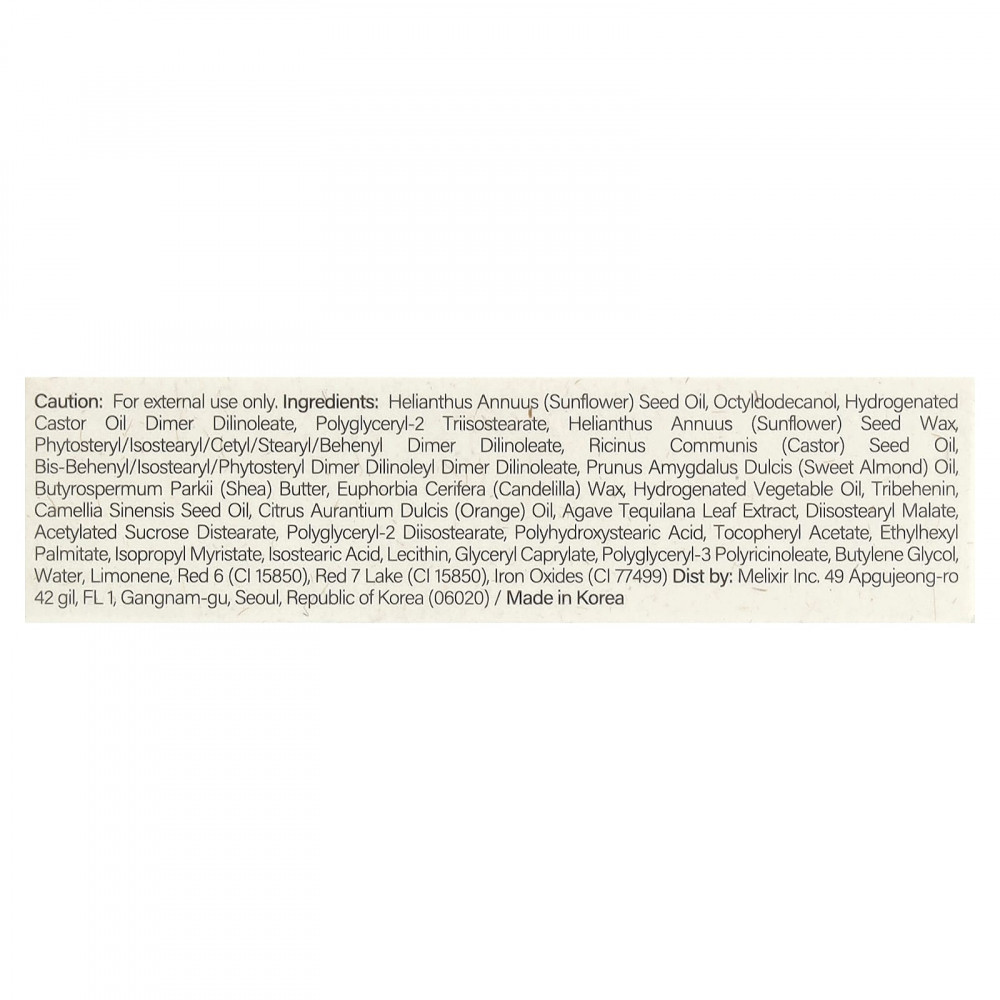Подсолнечное масло (Helianthus annuus), октилдодеканол, димер дилинолеат гидрогенизированного касторового масла, полиглицерил-2 триизостеарат, воск из семян подсолнечника (Helianthus annuus), фитостерил / изостеарил / цетил / стеарил / бегенил димер дилинолеат, касторовое масло (Ricinus communis), бис-бегенил/изостеарил/фитостерил димер дилинолеил димер дилинолеат, масло сладкого миндаля (Prunus amygdalus dulcis), масло ши (Butyrospermum parkii), канделильский воск (Euphorbia cerifera), гидрогенизированное растительное масло, трибехенин, масло из семян зеленого чая (Camellia sinensis), масло апельсина (Citrus aurantium dulcis), экстракт листьев голубой агавы (Agave tequilana), диизостеарил малат, ацетилированный дистеарат сахарозы, полиглицерил-2 диизостеарат, полигидроксистеариновая кислота, токоферилацетат, этилгексил пальмитат, изопропил миристат, изостеариновая кислота, лецитин, глицерил каприлат, полиглицерил-3-полирицинолеат, бутиленгликоль, вода, лимонен, краситель красный 6 (CI 15850), краситель красный 7 лак (CI 15850), оксиды железа (CI 77499).