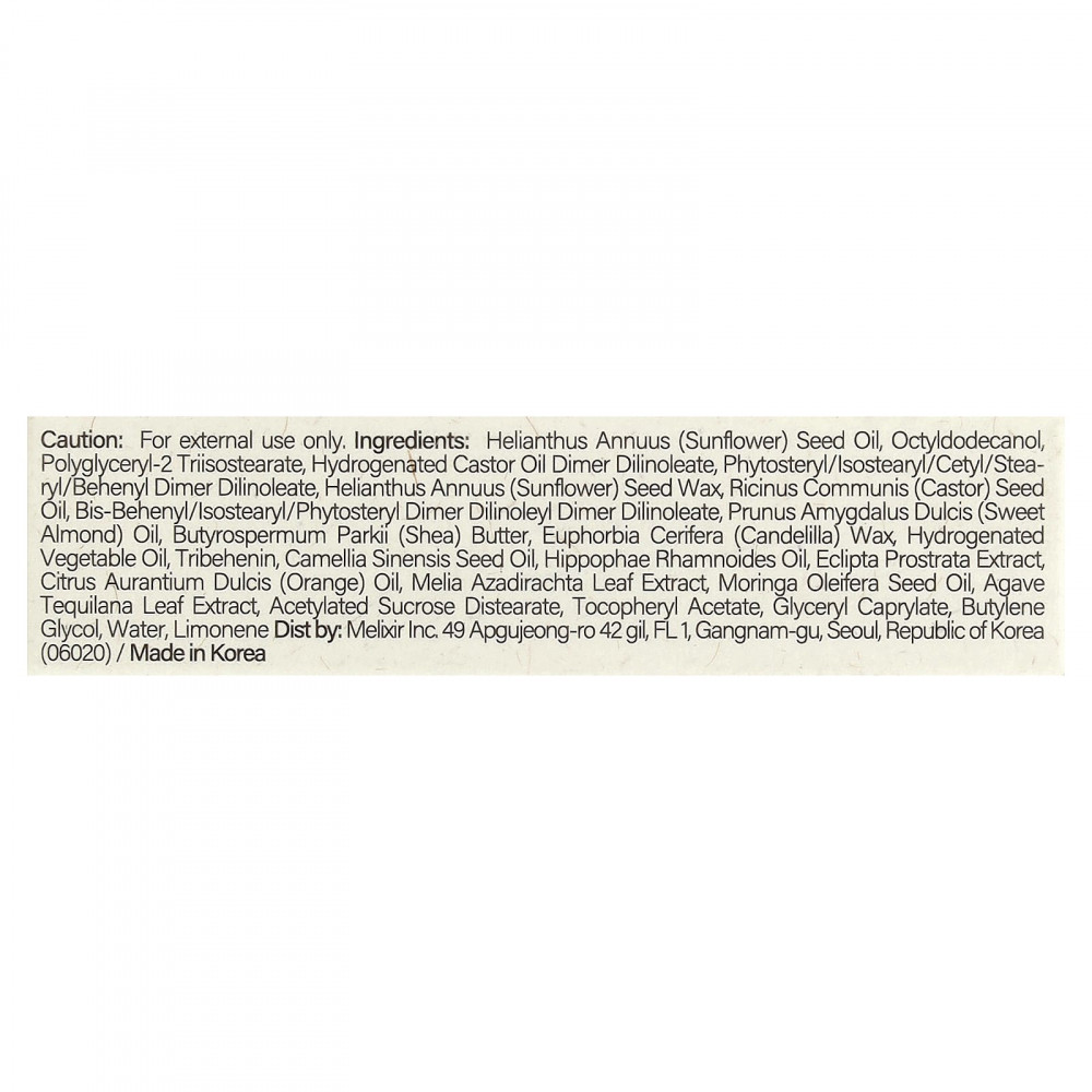 Масло семян подсолнечника (HeIanthus annuus), октилдодеканол, полиглицерил-2 триизостеарат, димер дилинолеат гидрогенизированного касторового масла, фитостерил / изостеарил / цетил / стеарил / бегенил димер дилинолеат, воск из семян подсолнечника (Helianthus annuus), касторовое масло (Ricinus communis), бис-бегенил/изостеарил/фитостерил димер дилинолеил димер дилинолеат, масло сладкого миндаля (Prunus amygdalus dulcis), масло ши (Butyrospermum parkii), канделильский воск (Euphorbia cerifera), гидрогенизированное растительное масло, трибехенин, масло из семян зеленого чая (Camellia sinensis), масло облепихи крушиновидной (Hippophae rhamnoides), экстракт эклипты простёртой (Eclipta prostrata), масло апельсина (Citrus aurantium dulcis), экстракт листьев дерева ним (Melia azadirachta), масло из семян моринги масличной (Moringa oleifera), экстракт листьев голубой агавы (Agave tequilana), ацетилированный дистеарат сахарозы, токоферилацетат, глицерил каприлат, бутиленгликоль, вода, лимонен.