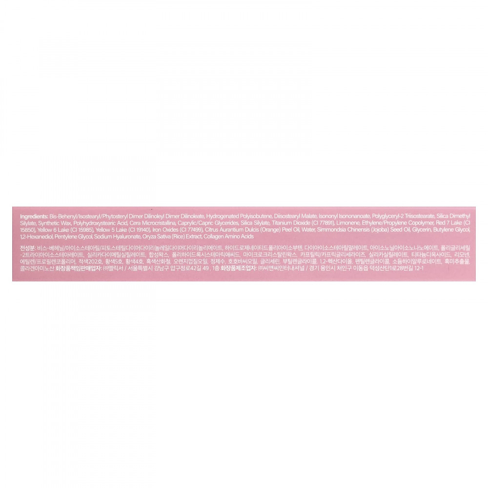 Бис-бегенил/изостеарил/фитостерил димер дилинолеил димер дилинолеат, гидрогенизированный полиизобутен, диизостеарил малат, изононил изононаноат, полиглицерил-2 триизостеарат, диметил силилат диоксида кремния, синтетический воск, полигидроксистеариновая кислота, микрокристаллический воск, каприловые/каприновые глицериды, силилат диоксида кремния, диоксид титана (CI 77891), лимонен, сополимер этилена/пропилена, краситель красный 7 лак (CI 15850), краситель желтый 6 лак (CI 15985), краситель жёлтый 5 лак (CI 19140), оксиды железа (CI 77499), масло из цедры апельсина (Citrus aurantium dulcis), вода, масло из семян жожоба (Simmondsia chinensis), глицерин, бутиленгликоль, 1,2-гександиол, пентилен гликоль, гиалуронат натрия, экстракт риса (Oryza sativa), коллагеновые аминокислоты.