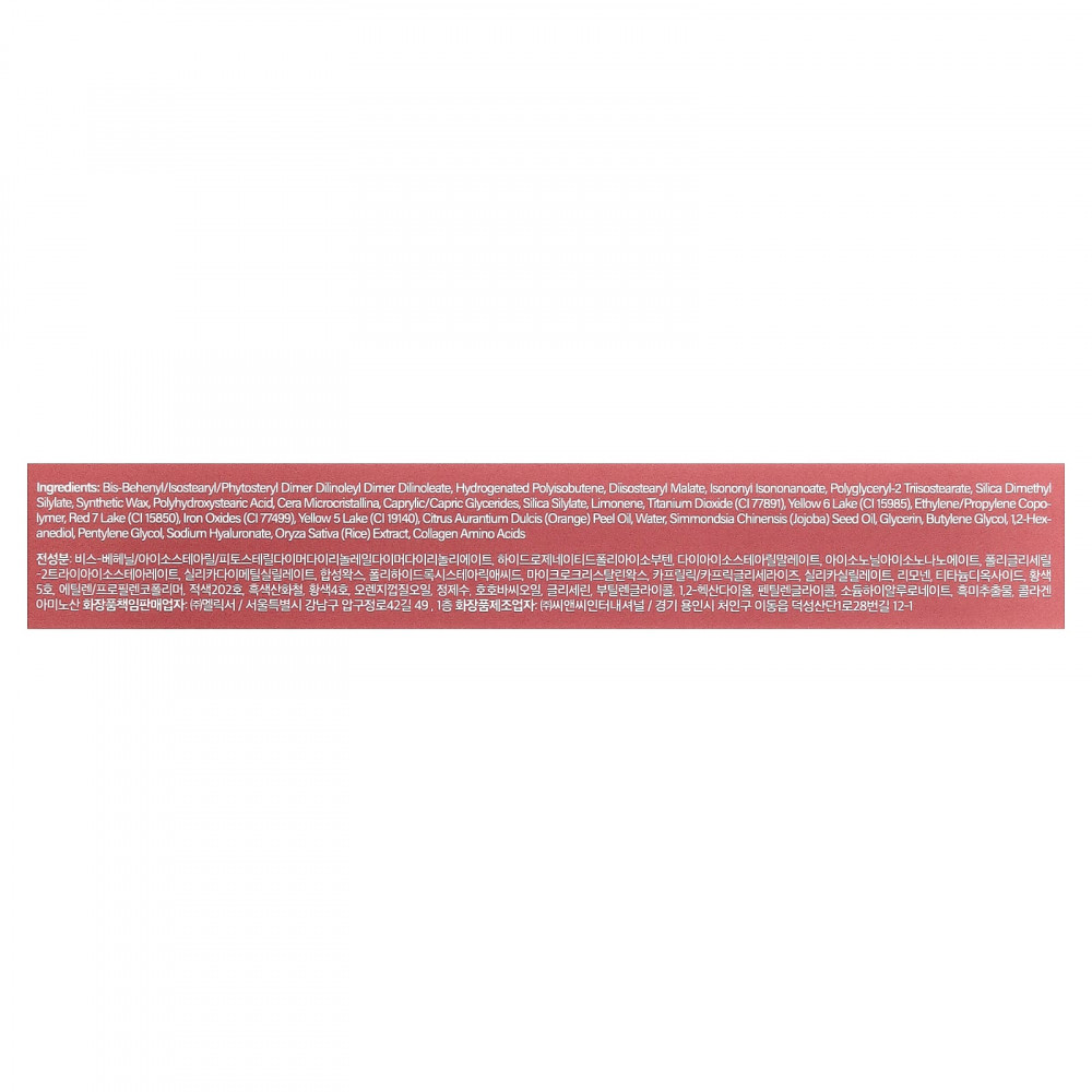 Бис-бегенил/изостеарил/фитостерил димер дилинолеил димер дилинолеат, гидрогенизированный полиизобутен, диизостеарил малат, изононил изононаноат, полиглицерил-2 триизостеарат, диметил силилат диоксида кремния, синтетический воск, полигидроксистеариновая кислота, микрокристаллический воск, каприловые/каприновые глицериды, силилат диоксида кремния, лимонен, диоксид титана (CI 77891), краситель желтый 6 лак (CI 15985), сополимер этилена/пропилена, краситель красный 7 лак (CI 15850), оксиды железа (CI 77499), краситель жёлтый 5 лак (CI 19140), масло из цедры апельсина (Citrus aurantium dulcis), вода, масло из семян жожоба (Simmondsia chinensis), глицерин, бутиленгликоль, 1,2-гександиол, пентилен гликоль, гиалуронат натрия, экстракт риса (Oryza sativa), коллагеновые аминокислоты.