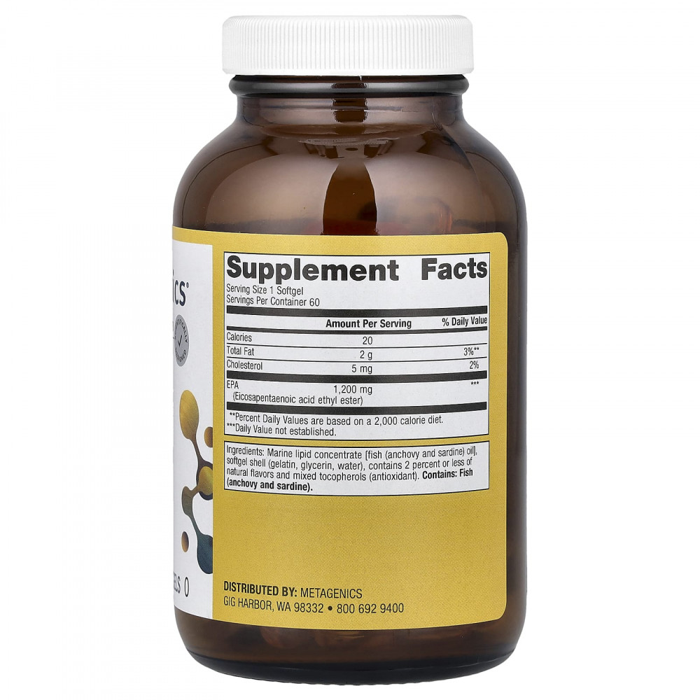Рыбий жир OmegaGenics® с ЭПК (1200 мг) является концентрированным и очищенным источником омега-3 жирных кислот из холодноводной рыбы, выловленной экологичным способом. Каждая капсула содержит 1200 мг ЭПК.