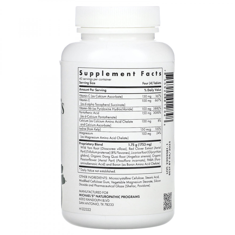 | Запатентованная смесь корень дикого ямса (Dioscorea villosa), экстракт красного клевера (надземная часть) (Trifolium pratense) (8% флавонов), корень солодки (Glycyrrhiza glabra), органический корень дягиля китайского (Angelica sinensis), органическая надземная часть пассифлоры (Passiflora incarnata), ПАБК (пара-аминобензойная кислота) и бор (в виде аминокислотного хелата бора) | 1,75 г (1753 мг) | * |