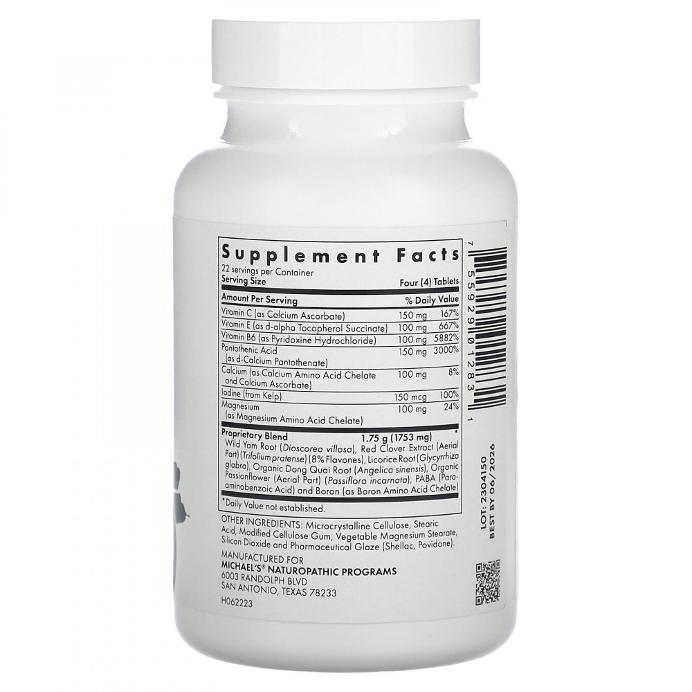 | Запатентованная смесь корень дикого ямса (Dioscorea villosa), экстракт красного клевера (надземная часть) (Trifolium pratense) (8% флавонов), корень солодки (Glycyrrhiza glabra), органический корень дягиля китайского (Angelica sinensis), органическая пассифлора (надземная часть) (Passiflora incarnata ), ПАБК (пара-аминобензойная кислота) и бор (в виде аминокислотного хелата бора) | 1,75 г (1753 мг) | * |
