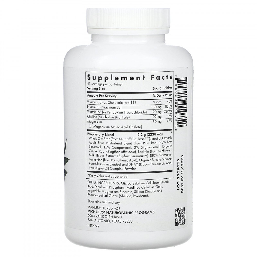 | Запатентованная смесь Цельные овсяные отруби (из овсяных отрубей Nutrim®**), инозитол, органическое яблоко, смесь фитостеролов (из сосны) (70% бета-ситостерола, 15% кампестерола, 2% стигмастерола), органический корень имбиря (Zingiber officinale), лецитин (из подсолнечника),экстракт расторопши (Silybum marianum) (80% силимарина),пантетин (из пантотеновой кислоты), корень органической иглицы колючей (Ruscus aculeatus) и ДГК† (докозагексаеновая кислота) из комплекса масел из водорослей | 2,2 г (2238 мг) | * |