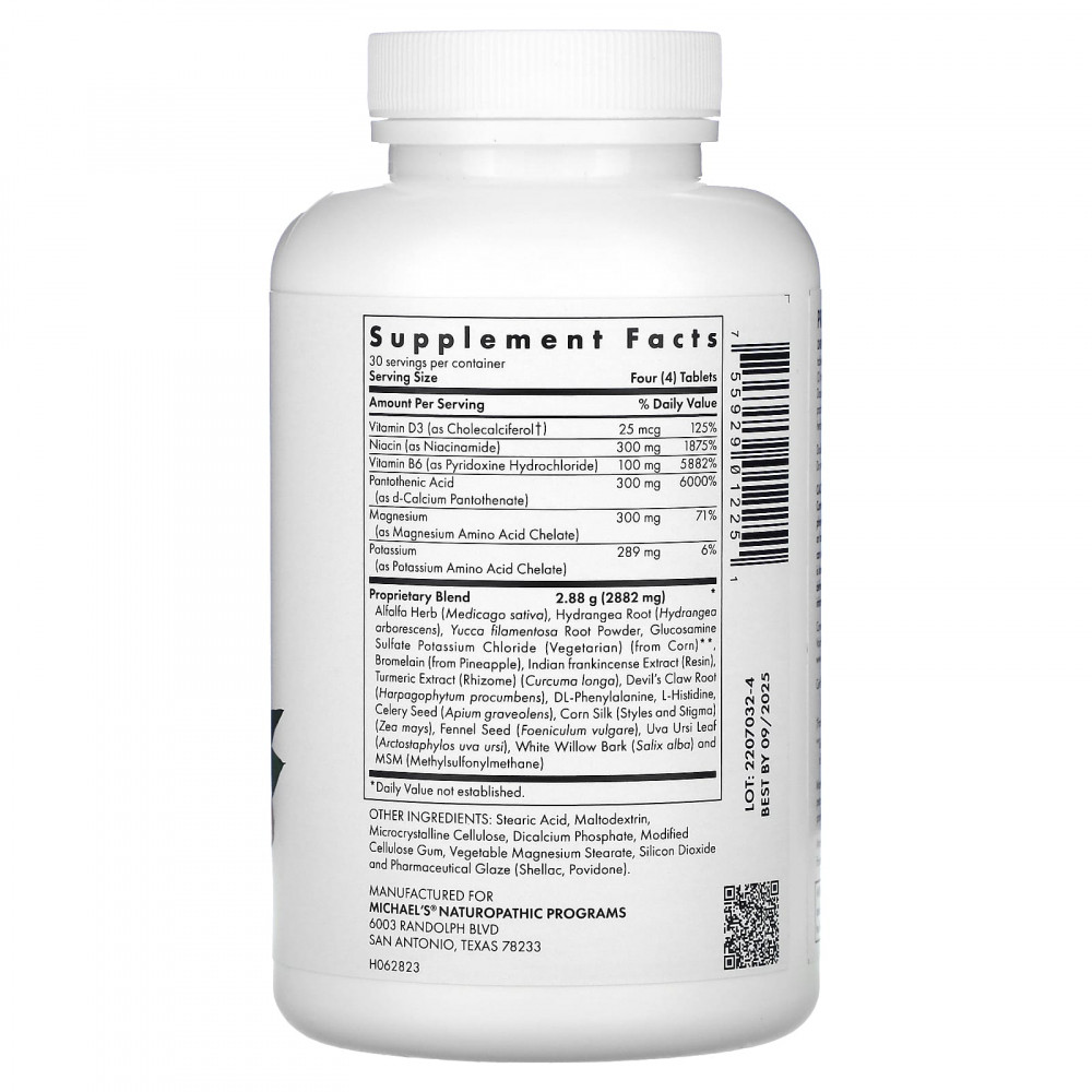 | Запатентованная смесь трава люцерны (Medicago sativa), корень гортензии древовидной (Hydrangea arborescens), порошок из корня юкки нитевидной, глюкозамин сульфат и хлорид калия (вегетарианский) (из кукурузы)**, бромелаин (из ананаса), экстракт индийского ладана (смола), экстракт куркумы (корневище (Curcuma longa), корень гарпагофитума (Harpagophytum procumbens), DL-фенилаланин, L-гистидин, семена сельдерея (Apium graveolens), кукурузные рыльца (стигма и рыльца) (Zea mays), семена фенхеля (Foeniculum vulgare), толокнянка обыкновенная (Uva ursi) Листья (Arctostaphylos uva ursi), кора ивы белой (Salix alba) и МСМ (метилсульфонилметан) | 2,88 г (2882 мг) | * |