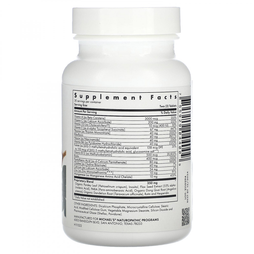 | Запатентованнаясмесь органические листья петрушки (Petroselinum crispum), инозитол, экстракт семян льна (55% альфа-линоленовой кислоты), ПАБК (парааминобензойная кислота), органический корень дягиля лекарственного (Angelica sinensis), органический корень одуванчика (Taraxacum officinale), рутин и гесперидин | 350 мг | * |