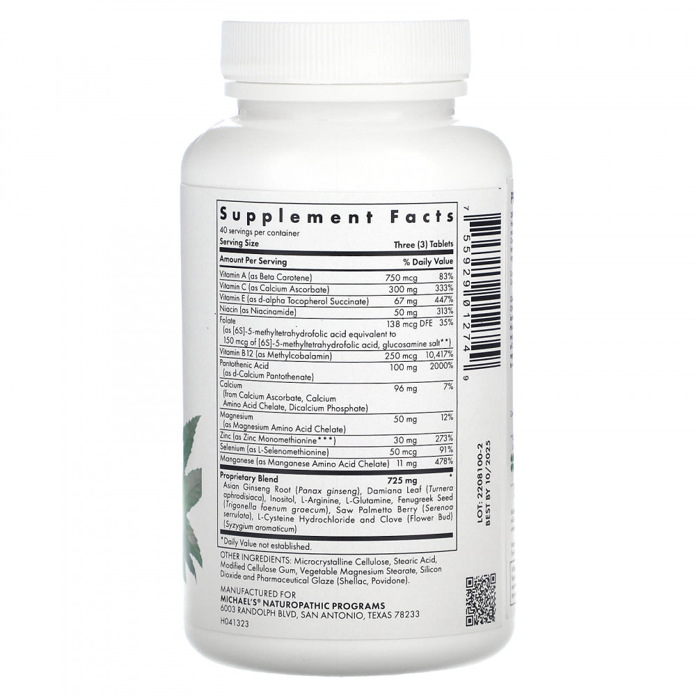| Proprietary Blend Asian Ginseng Root (Panax ginseng), Damiana Leaf (Turnera aphrodisiaca), Inositol, L-Arginine, L-Glutamine, Fenugreek Seed (Trigonella foenum graecum), Saw Palmetto Berry (Serenoa serrulata), L-Cysteine Hydrochloride and Clove (Flower Bud) (Syzygium aromaticum) | 725 mg | * |