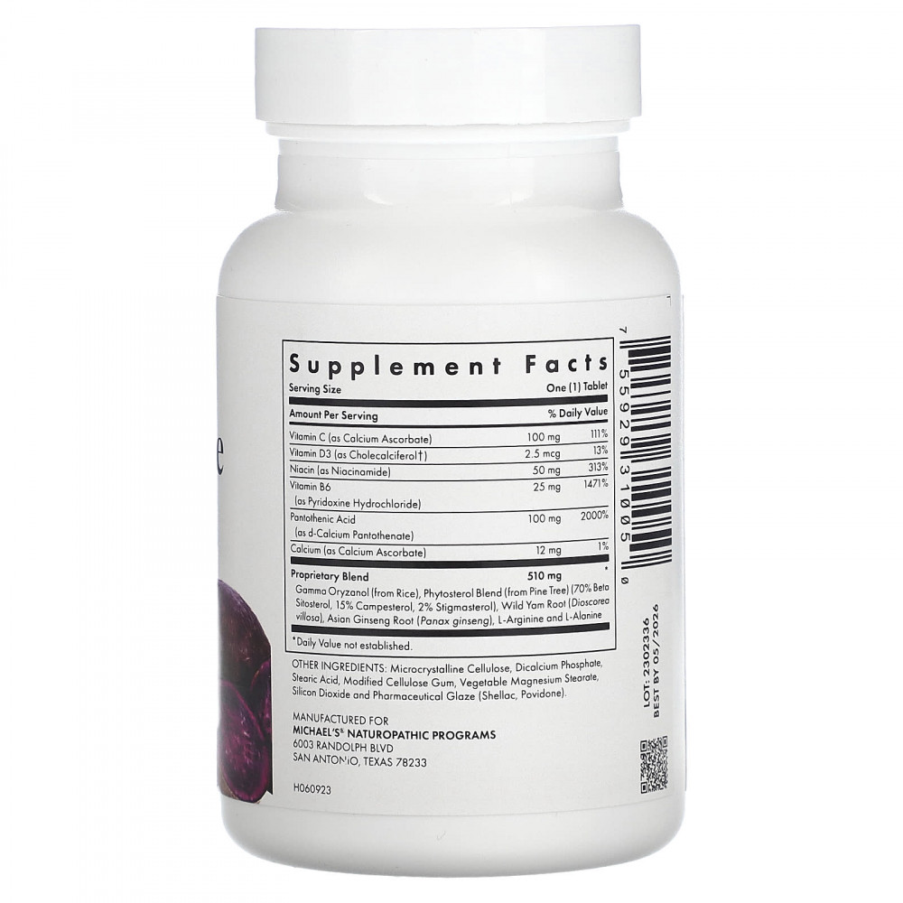 | Запатентованная смесь Гамма оризанол (из риса), смесь фитостеролов (из сосны) (70% бета-ситостерола, 15% кампестерина, 2% стигмастерола), корень дикого ямса (Dioscorea villosa), корень женьшеня азиатского (Panax ginseng), L-аргинин и L-аргинин — аланин | 510 мг | * |