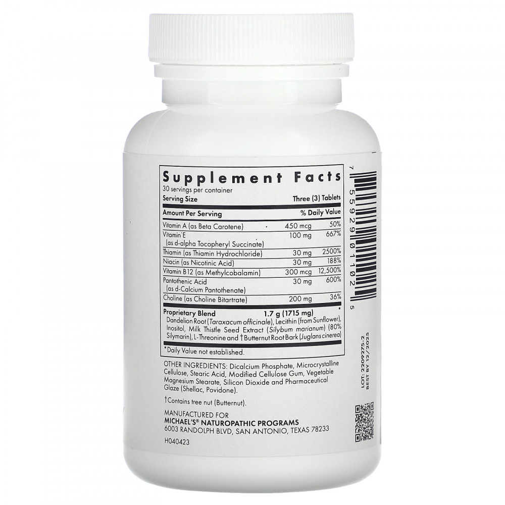 Содержит липотропные факторы, такие как холин, инозит и метионин, а также расторопшу и корень одуванчика.