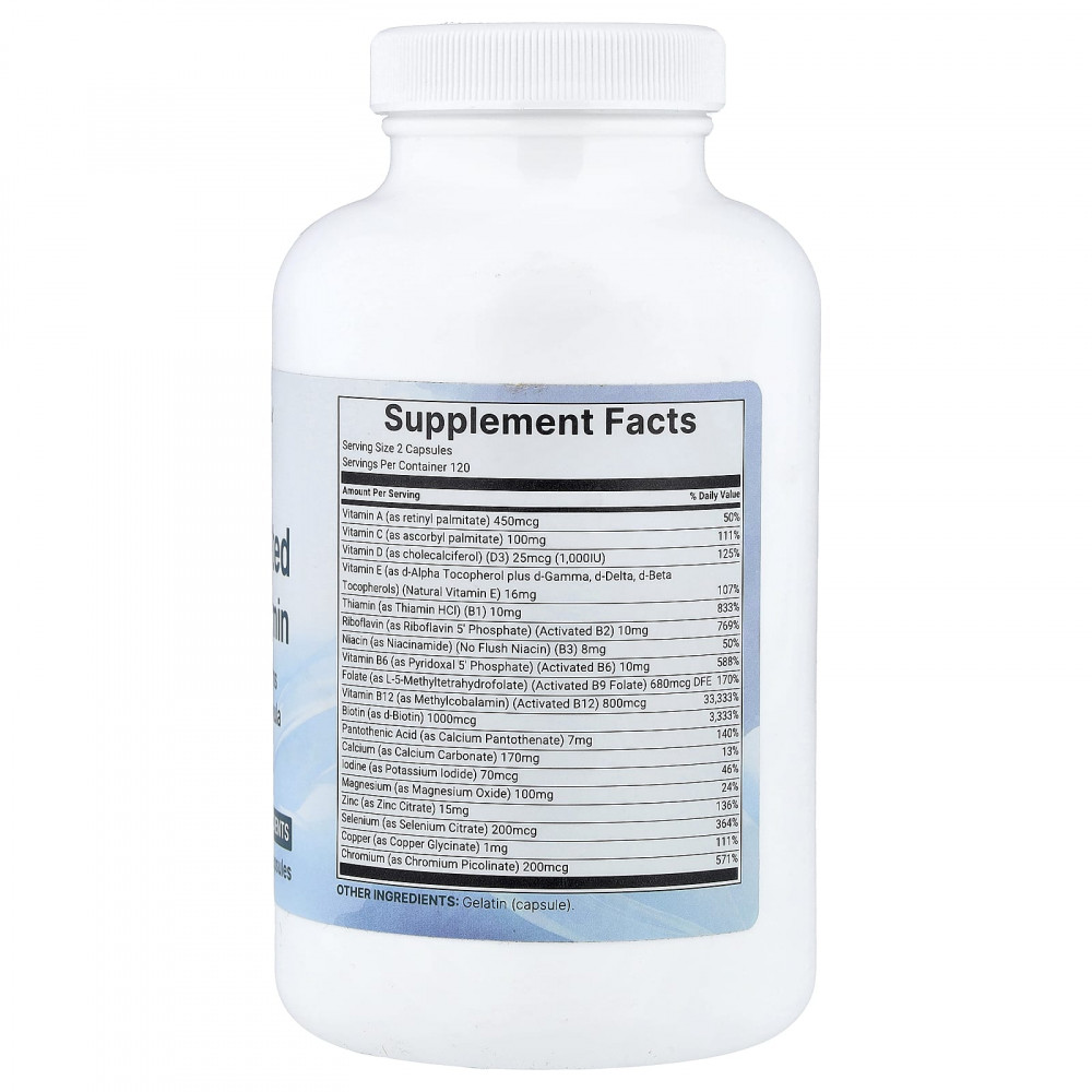 В каждом флаконе содержится 240 капсул. Содержит важные питательные вещества, такие как жирорастворимый витамин C (аскорбил пальмитат), A, D3, E, рибофлавин (R5P), ниацин (ниацинамид), B6 (P5P), фолат, витамин B12 (метилкобаламин), кальций, йод и хром.