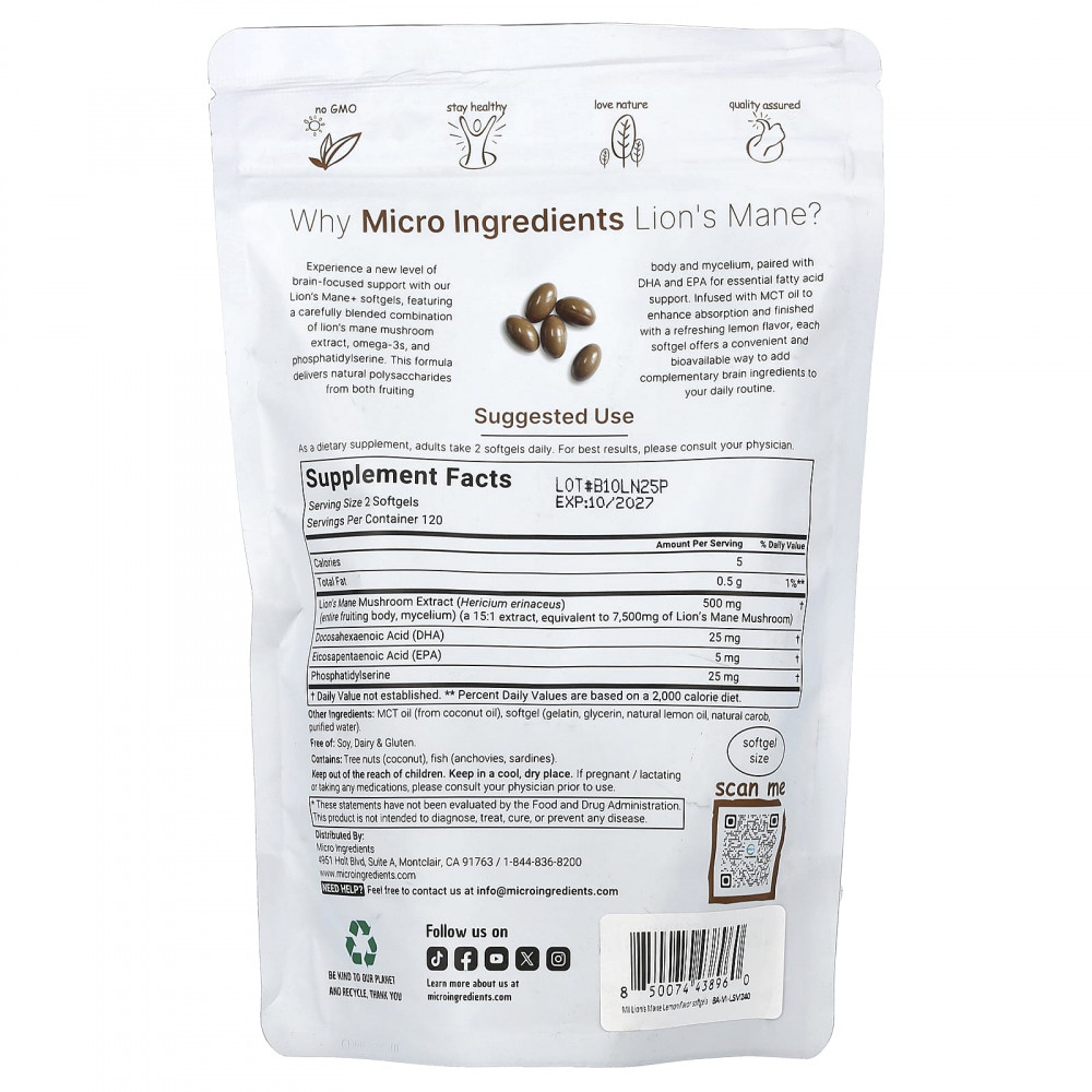 Получите новый уровень поддержки здоровья мозга с помощью наших капсул ежовика гребенчатого+, содержащих тщательно подобранную комбинацию экстракта гриба ежовика гребенчатого, омега-3 и фосфатидилсерина. Эта формула содержит натуральные полисахариды из плодового тела и мицелия в сочетании с ДГК и ЭПК для поддержки незаменимых жирных кислот. Каждая капсула, содержащая масло MCT для лучшего усвоения, имеет освежающий лимонный вкус, и предлагает удобный и биодоступный способ добавить дополнительные ингредиенты для здоровья мозга в ваш ежедневный рацион.