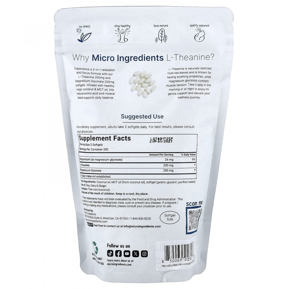 Испытайте формулу 2-в-1 для расслабления и концентрации внимания с нашими мягкими таблетками L-теанина 200 мг и глицината магния 200 мг. Эта смесь натуральных аминокислот и минералов, содержащая полезные для здоровья кокосовые орехи и масло MCT, поддерживает ежедневный баланс. L-теанин естественным образом получают из чайных листьев и известны своими успокаивающими свойствами, а глицинат магния борется с мышечным напряжением. Принимайте ежедневно утром или вечером, чтобы насладиться нежной поддержкой и улучшить ваше здоровье.