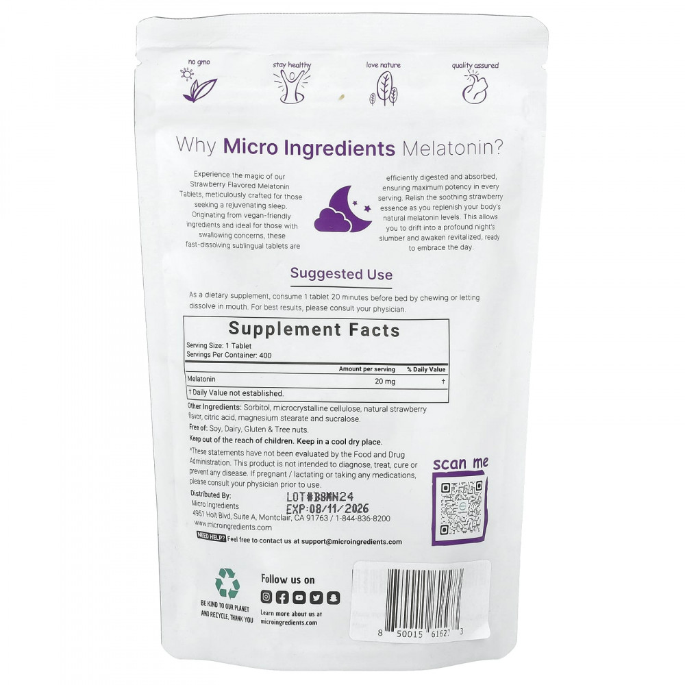 Ощутите магию наших таблеток мелатонина со вкусом клубники, тщательно созданных для тех, кто ищет омолаживающий сон. Эти быстрорастворимые сублингвальные таблетки, изготовленные из безопасных для веганов ингредиентов, идеально подходят для тех, кто испытывает проблемы с глотанием, эффективно перевариваются и усваиваются, обеспечивая максимальную эффективность в каждой порции. Наслаждайтесь успокаивающей клубничной эссенцией и восполните естественный уровень мелатонина в организме. Это позволяет вам погрузиться в глубокий ночной сон и проснуться бодрым, готовым к встрече с днем.