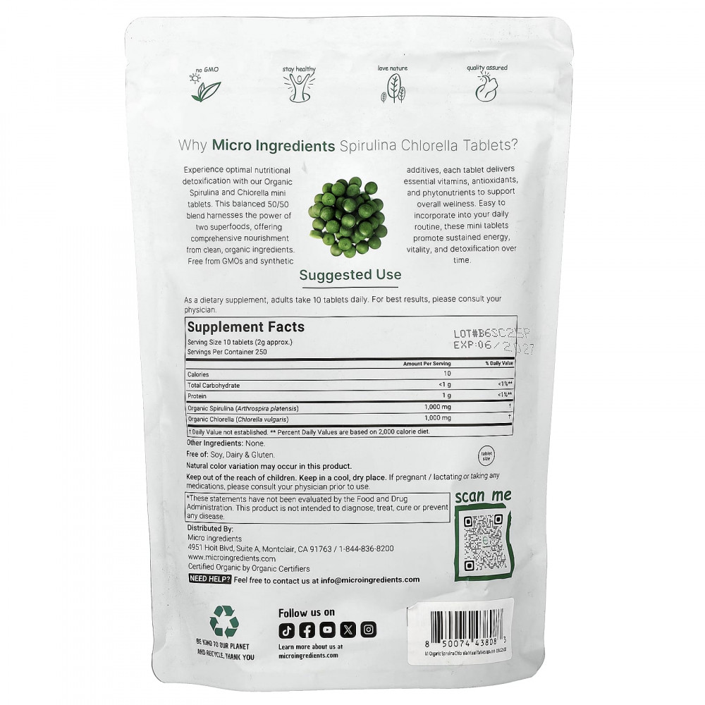 Обеспечьте оптимальную детоксикацию с помощью наших мини-таблеток из органической спирулины и хлореллы. Эта сбалансированная смесь 50/50 использует силу двух суперфудов, обеспечивая комплексное питание из чистых органических ингредиентов. Каждая таблетка не содержит ГМО и синтетических добавок, содержит необходимые витамины, антиоксиданты и фитонутриенты для поддержания общего самочувствия. Эти мини-таблетки легко включить в ваш повседневный рацион. Они способствуют поддержанию уровня энергии, жизненной силы и детоксикации с течением времени.