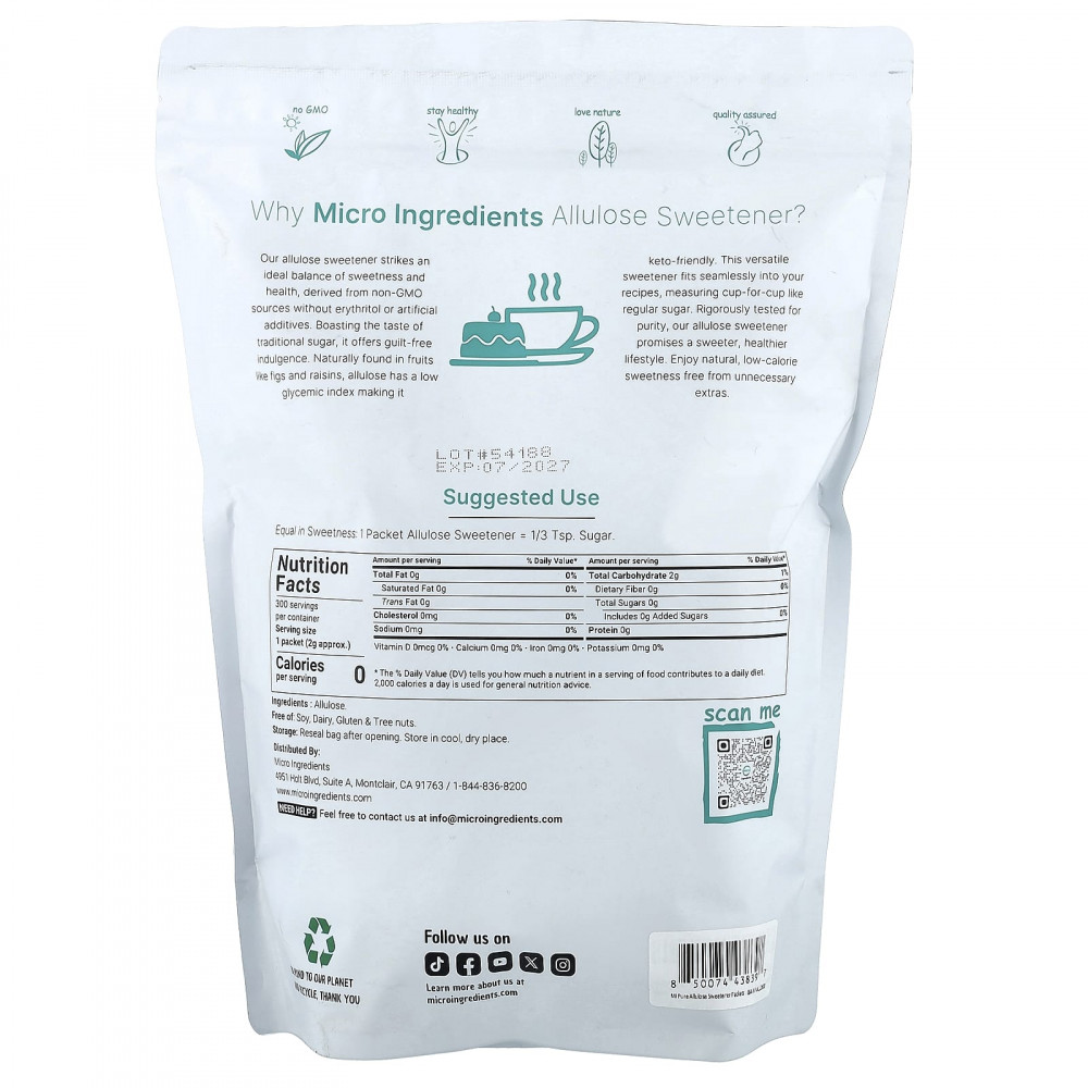 Наш подсластитель с аллюлозой обеспечивает идеальный баланс сладости и здоровья. Он получен из источников без ГМО, без эритритола и искусственных добавок. Он имеет вкус традиционного сахара и не вызывает чувства вины. Аллюлоза, которая естественным образом содержится в таких фруктах, как инжир и изюм, имеет низкий гликемический индекс, что делает её подходящей для кетодиеты. Этот универсальный подсластитель легко впишется в ваши рецепты, отмеряя чашку в чашке, как обычный сахар. Наш подсластитель с аллюлозой, прошедший тщательное тестирование на чистоту, обещает более сладкий и здоровый образ жизни. Наслаждайтесь натуральной низкокалорийной сладостью без ненужных добавок.