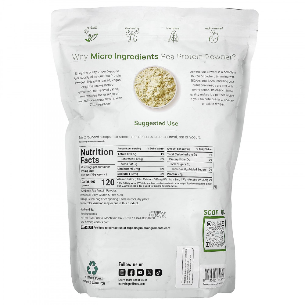 Наслаждайтесь чистотой нашего 5-фунтового запаса натурального порошка из горохового протеина. Это веганское лакомство на растительной основе без подсластителей, без добавок животного происхождения и сочетает в себе суть сырых, мягких и нейтральных вкусов. Наш порошок содержит 27 г протеина в каждой порции и является полноценным источником протеина, насыщенным BCAA и EAA, обеспечивая удовлетворение ваших потребностей в питательных веществах с каждой мерной ложкой. Его легко смешивать, что делает его идеальным дополнением к вашим любимым кулинарным рецептам, напиткам или выпечке.