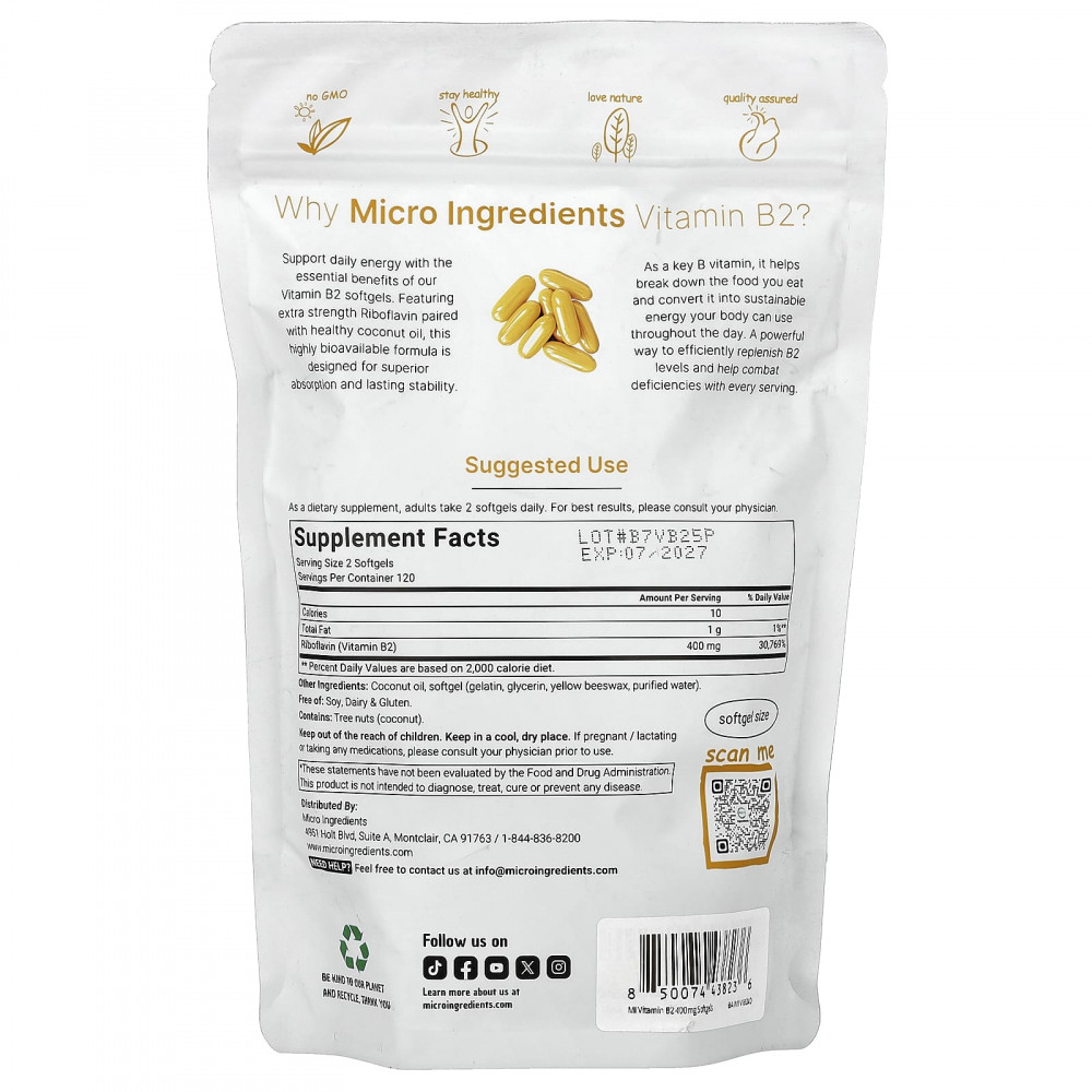 Поддержите уровень энергии с помощью основных преимуществ наших капсул с витамином B2. Это средство с высокой биодоступностью, содержащее рибофлавин повышенной силы действия в сочетании с полезным кокосовым маслом, разработано для превосходного усвоения и длительной стабильности. Являясь ключевым витамином группы B, он помогает расщеплять съеденную пищу и преобразовывать ее в устойчивую энергию, которую организм может использовать в течение дня. Эффективный способ эффективно восполнить уровень витамина B2 и бороться с его дефицитом в каждой порции.