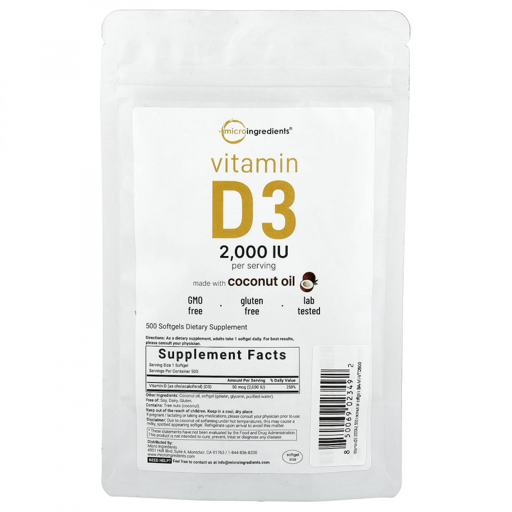 Micro Ingredients предлагает эффективно усваиваемые капсулы витамина D3, которые содержат полезное кокосовое масло для повышения биодоступности. Наслаждайтесь незаменимым витамином D в виде чистого холекальциферола.