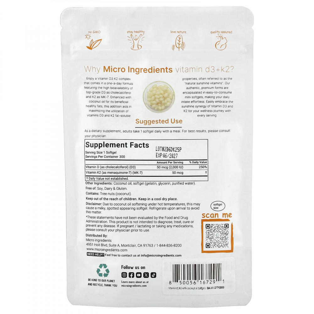 Наслаждайтесь комплексом витаминов D3 и K2, который входит в состав ежедневной формулы, обладающей высокой биодоступностью высококачественного витамина D3 в виде холекальциферола и K2 в виде MK-7. Эта добавка, обогащенная кокосовым маслом из-за его полезных жиров, помогает максимально использовать жирорастворимые витамины D3 и K2, которые часто называют «натуральными солнечными витаминами». Наши аутентичные премиальные формы заключены в удобные мини-капсулы, что позволяет без труда принимать их ежедневно. Обеспечьте синергию витаминов D3 и K2 для хорошего самочувствия с каждой порцией.