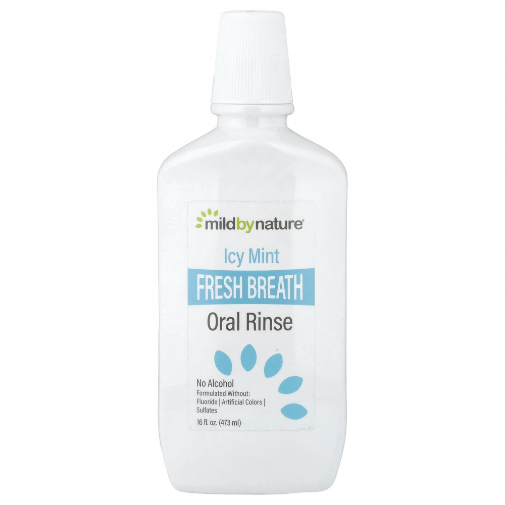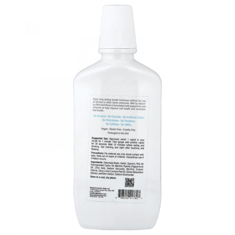 Освежающий ополаскиватель для полости рта с ароматом ледяной мяты от Mild By Nature содержит ксилитол, перечную мяту, ментол, минералы и касторовое масло для улучшения здоровья полости рта и нейтрализации неприятного запаха*.