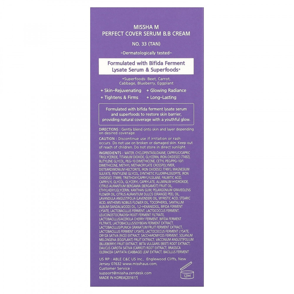 Вода, циклопентасилоксан, каприловый/каприновый триглицерид, диоксид титана, глицерин, оксиды железа (CI 77492), бутиленгликоль, ПЭГ-10 диметикон, цетил ПЭГ/ППГ-10/1 диметикон, метил метакрилат кроссполимер, дистеардимония гекторит, оксиды железа (CI 77491), сульфат магния, пентилен гликоль, синтетический фторфлогопит, оксиды железа (CI 77499), триэтоксикаприлилсилан, пальмитиновая кислота, каприлилгликоль, глицерил каприлат, гидроксид алюминия, масло бергамота (Citrus aurantium bergamia), этилгексилглицерин, ксантановая камедь, масло из цветков герани (Pelargonium graveolens), масло из цедры апельсина (Citrus aurantium dulcis), лавандовое масло (Lavandula angustifolia), миристиновая кислота, стеариновая кислота, масло цветков ромашки английской (Anthemis nobilis), токоферол, масло сандалового дерева (Santalum album), 1,2-гександиол, лизат ферментов бифидобактерий, фермент лактобактерий (Lactobacillus), фермент лактококка (Lactococcus), лейконосток/ферментированный фильтрат корня редиса, продукт ферментации ацеролы с лактобактериями, фильтрат продукта ферментации бифидобактерий, лактобактерии /ферментированный экстракт соевых бобов, экстракт продукта ферментации граната (Punica granatum) с лактобактериями, лизат продукта ферментации лактобактерий, лизат ферментов лактококка, экстракт риса (Oryza sativa), продукт ферментации сахаромицетов, экстракт плодов баклажана (Solanum melongena), экстракт ягод голубики (Vaccinium angustifolium), экстракт корнеплода свеклы (Beta vulgaris), экстракт корнеплода моркови (Daucus carota sativa), экстракт листьев капусты огородной (Brassica oleracea), продукт ферментации бактерий.