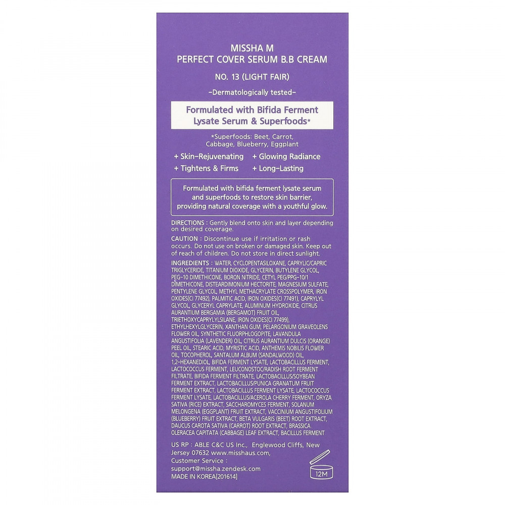Вода, циклопентасилоксан, каприловый/каприновый триглицерид, диоксид титана, глицерин, бутиленгликоль, ПЭГ-10 диметикон, нитрид бора, цетил ПЭГ/ППГ-10/1 диметикон, дистеардимония гекторит, сульфат магния, пентилен гликоль, метил метакрилат кроссполимер, оксиды железа (CI 77492), пальмитиновая кислота, оксиды железа (CI 77491), каприлилгликоль, глицерил каприлат, гидроксид алюминия, масло бергамота (Citrus aurantium bergamia), триэтоксикаприлилсилан, оксиды железа (CI 77499), этилгексилглицерин, ксантановая камедь, масло из цветков герани (Pelargonium graveolens), синтетический фторфлогопит, лавандовое масло (Lavandula angustifolia), масло из цедры апельсина (Citrus aurantium dulcis), стеариновая кислота, миристиновая кислота, масло цветков ромашки английской (Anthemis nobilis), токоферол, масло сандалового дерева (Santalum album), 1,2-гександиол, лизат ферментов бифидобактерий, фермент лактобактерий (Lactobacillus), фермент лактококка (Lactococcus), лейконосток/ферментированный фильтрат корня редиса корня редиса, фильтрат фермента бифидобактерий, лактобактерии /ферментированный экстракт соевых бобов, экстракт продукта ферментации граната (Punica granatum) с лактобактериями, лизат продукта ферментации лактобактерий, лизат ферментов лактококка, продукт ферментации ацеролы с лактобактериями, экстракт риса (Oryza sativa), продукт ферментации сахаромицетов, экстракт плодов баклажана (Solanum melongena), экстракт ягод голубики (Vaccinium angustifolium), экстракт корнеплода свеклы (Beta vulgaris), экстракт корнеплода моркови (Daucus carota sativa), экстракт листьев капусты огородной (Brassica oleracea), продукт ферментации бактерий.