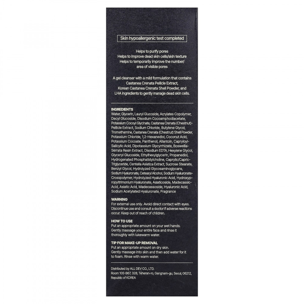 Очищающий гель с мягким составом, содержащим экстракт кожуры кастанеи кренатной (Castanea crenata), корейский порошок из скорлупы кастанеи кренаты (Castanea crenata) и ингредиенты с ЛГК для бережного удаления омертвевших клеток кожи.