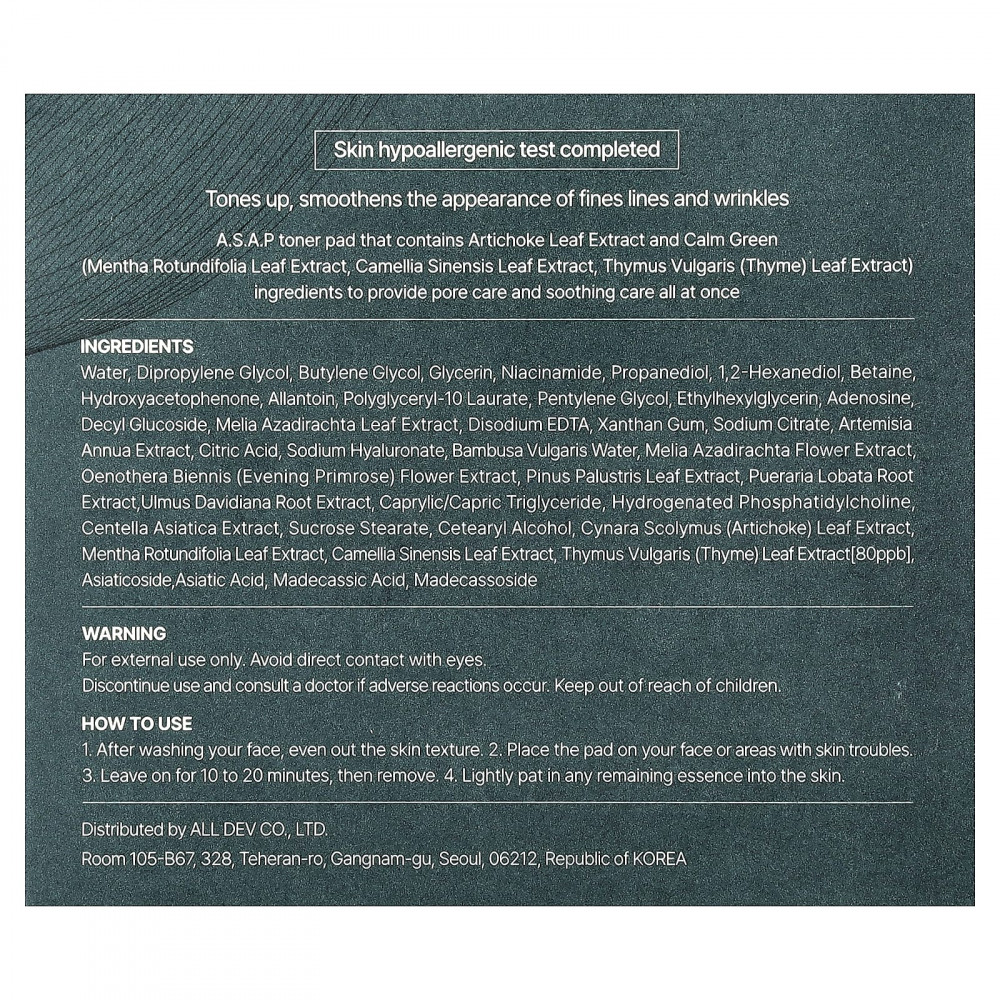 Тонизирующие диски ASAP содержат экстракт листьев артишока и зелень (экстракт листьев мяты круглолистной (Mentha rotundifolia), экстракт листьев зеленого чая (Camellia sinensis), экстракт листьев чабреца) для одновременного ухода за порами и успокаивающего ухода.